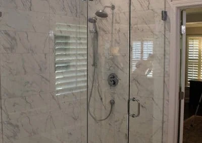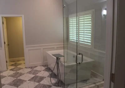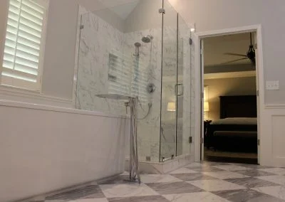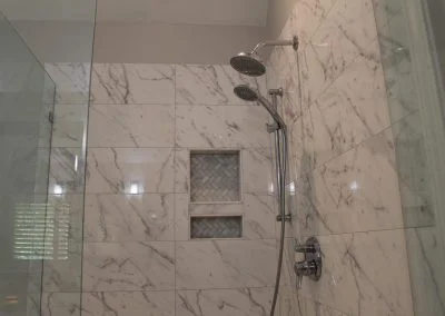Marble Look Shower Design Marble Look Porcelain In Shower Decorative Shampoo Niche Contemporary Freestanding Tub Modern Bathroom Design Modern Grey White Bathroom White Bathroom Vanity White Grey Marble Floor